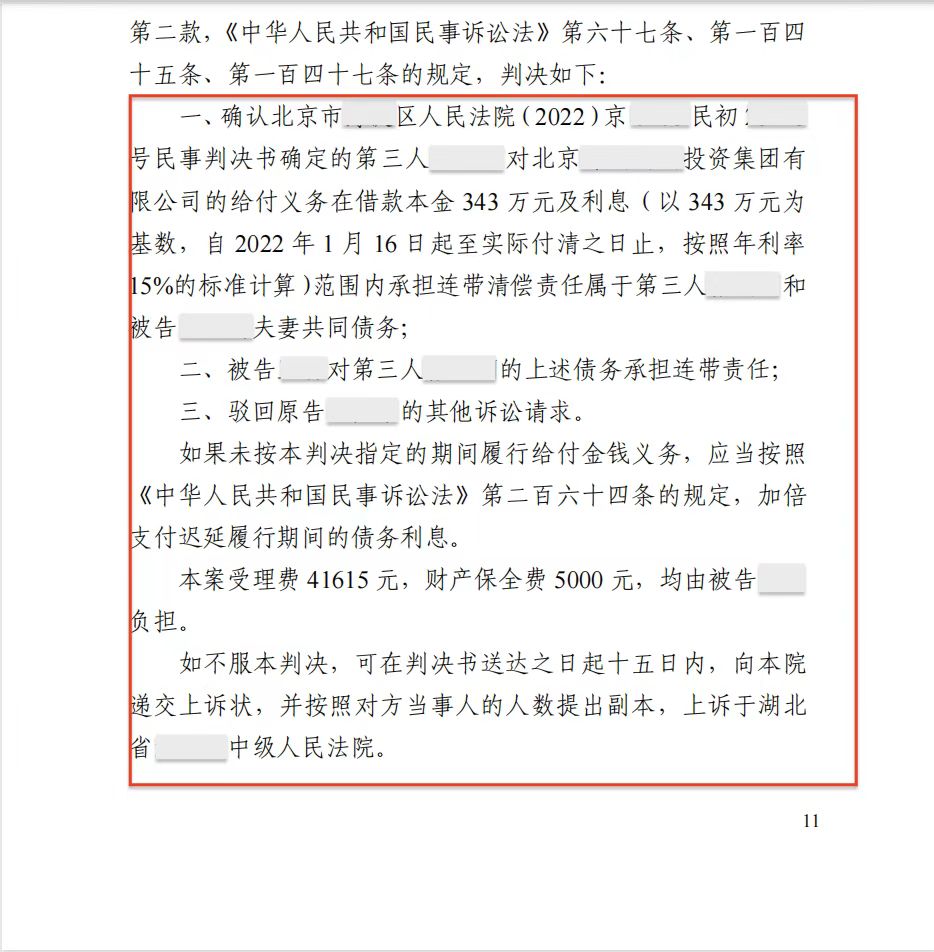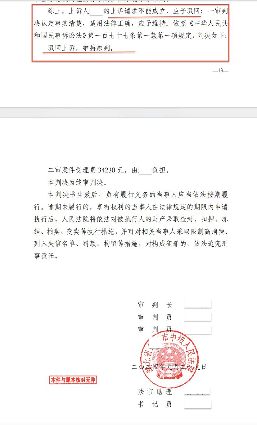 经过二次开庭,最终,法院采纳我方代理意见,认定案涉债务为夫妻共同债务,张先生配偶需要承担连带清偿责任,且判决书直接照搬了代理意见中关于银行流水统计分析的逻辑和路径,认定该债务为夫妻共同债务,完全达成了当事人的诉讼目的。一审胜诉后,对方不服判决,向市中级人民法院提起上诉。二审认定该债务构成夫妻共同债务。驳回上诉,维持原判。