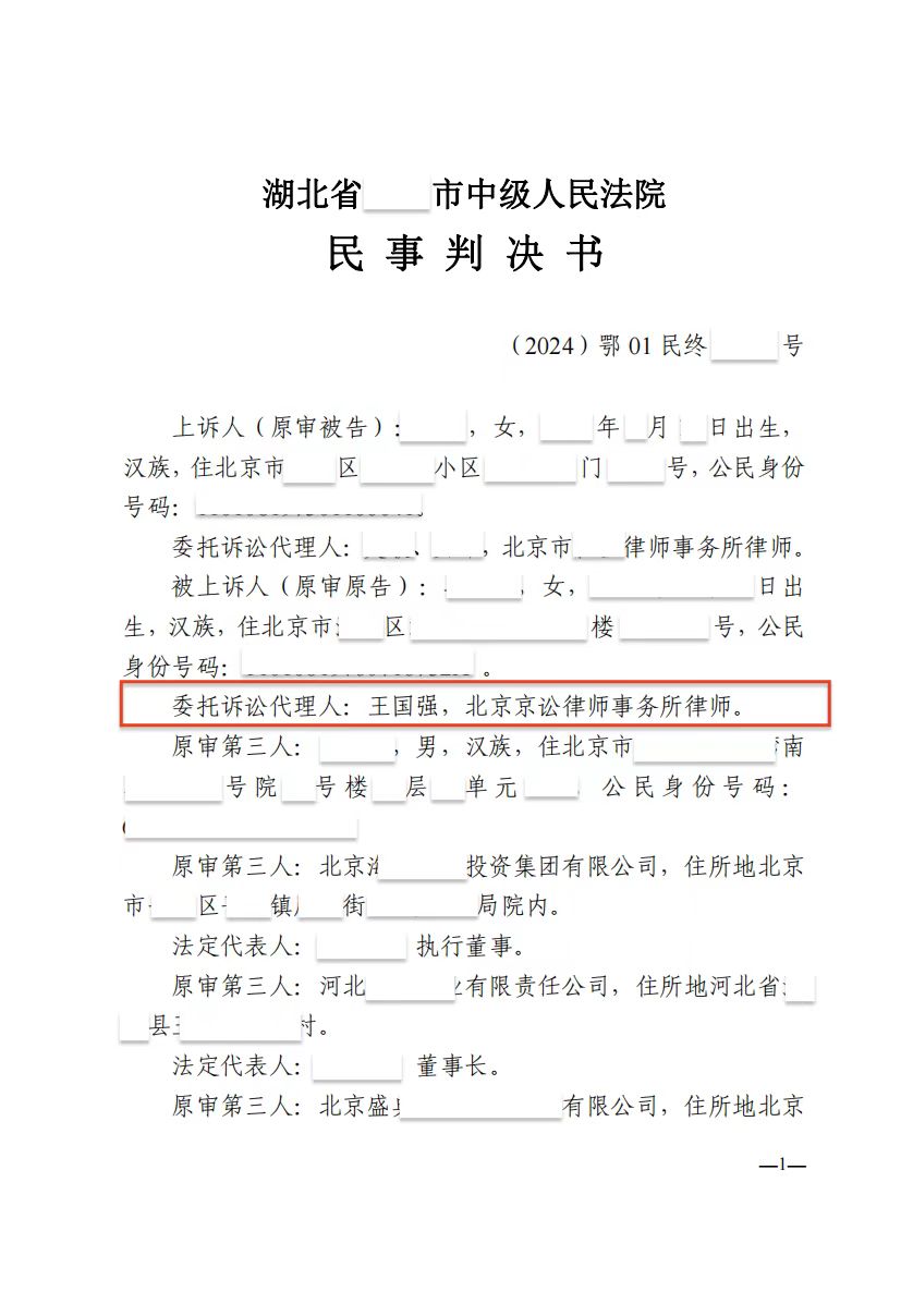 近日,由北京京讼律师事务所王国强律师代理的段女士与张某夫妇、北京某投资集团有限公司民间借贷纠纷执行异议一案,经北京市海淀区人民法院依法审理,裁定驳回案外人被执行人之女的全部异议请求,委托人段女士的合法债权得到有力维护!执行款已划扣至法院账户!