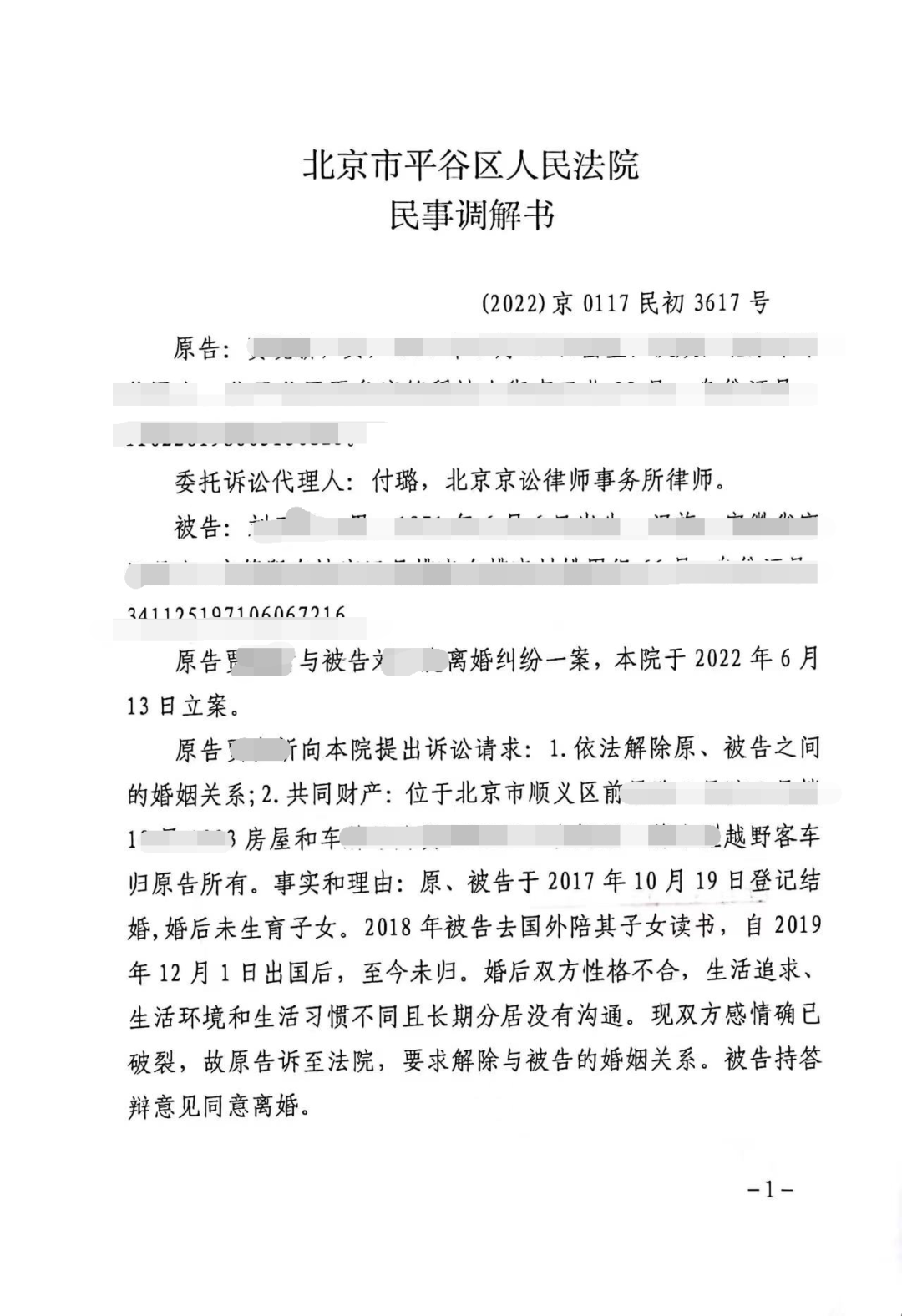 2.共同财产:位于北京市顺义区房屋和小型越野客车归原告所有。